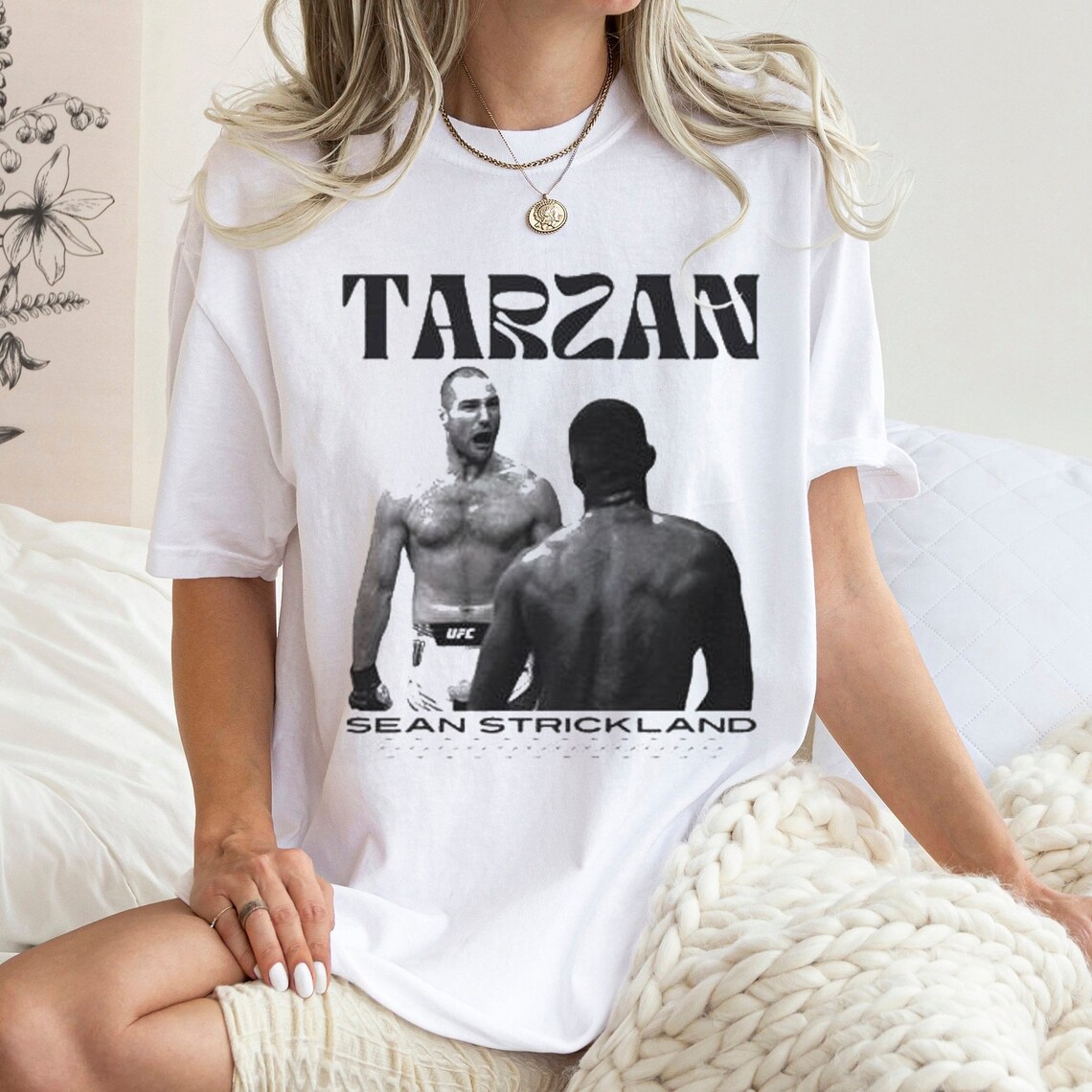 This shirt pays tribute to Sean Strickland, aptly named “Tarzan” for his strength and resilience. It represents not only support for the fighter but also embodies the spirit of determination and courage in the face of challenges.